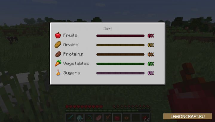 Мод на диету Diet делит в игре Майнкрафт все продукты на 5 категорий (фрукты, злаки, овощи, белки и сахар). В вашу задачу входит правильное распределение пищи при питании (соблюдение диеты). В результате вы сможете получить призовые очки здоровья и некоторые эффекты, которые вы сможете выбрать в настройках мода.
